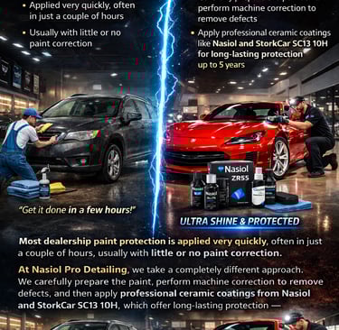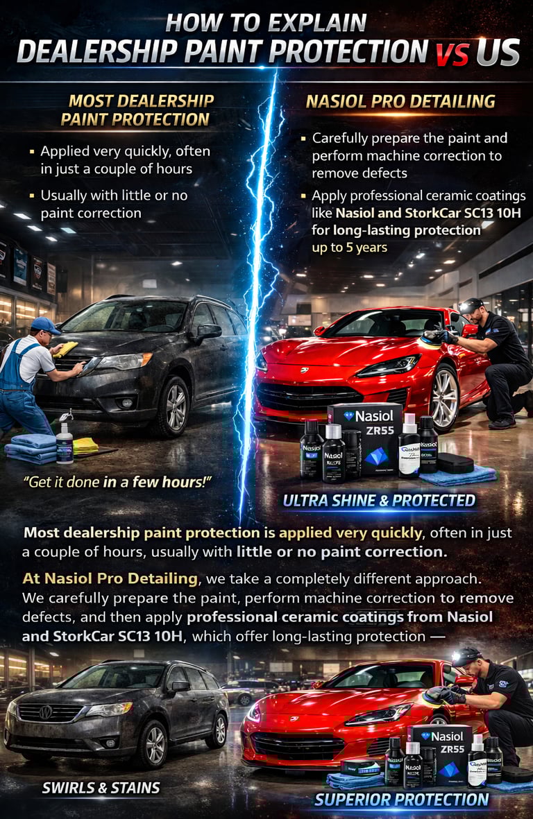 “Dealership protection is sold as a quick add-on. What we do at Nasiol Pro Detailing is full correction + premium coatings using Nasiol and StorkCar products — results last longer and the finish is flawless.”